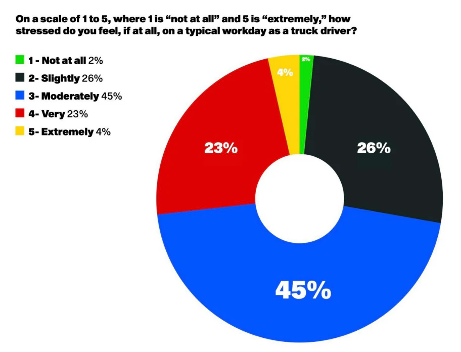 Опрос от DAT Freight & Analytics показал, что около 75 процентов опрошенных водителей коммерческого транспорта считаю свою работу физически и эмоциональной сложной и стрессовой. Небольшая часть опрошенных ответили, что эмоционально и физически справляются с тяжбами работы и обращаются за помощью, когда нуждаются в ней.