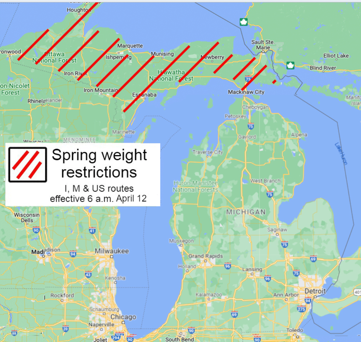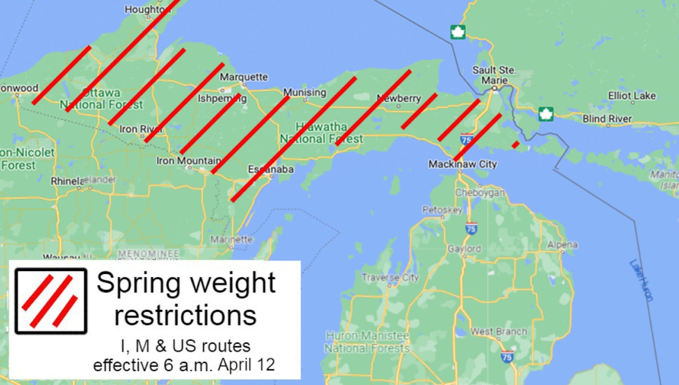 Начиная с 6 часов утра в среду, 12 апреля, весовые ограничения будут повышены на всех федеральных магистралях от южной границы Мичингана на север до моста Макино.